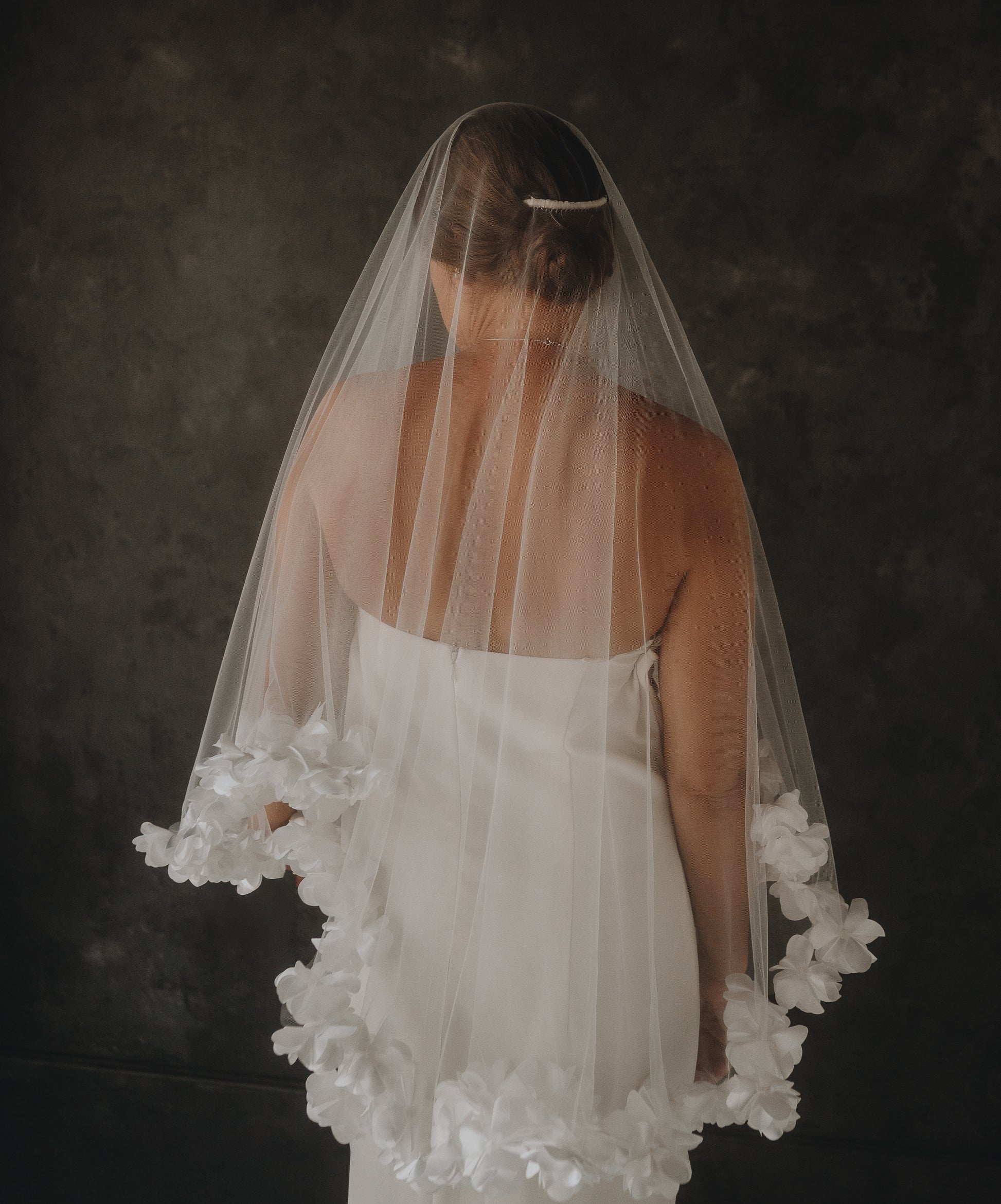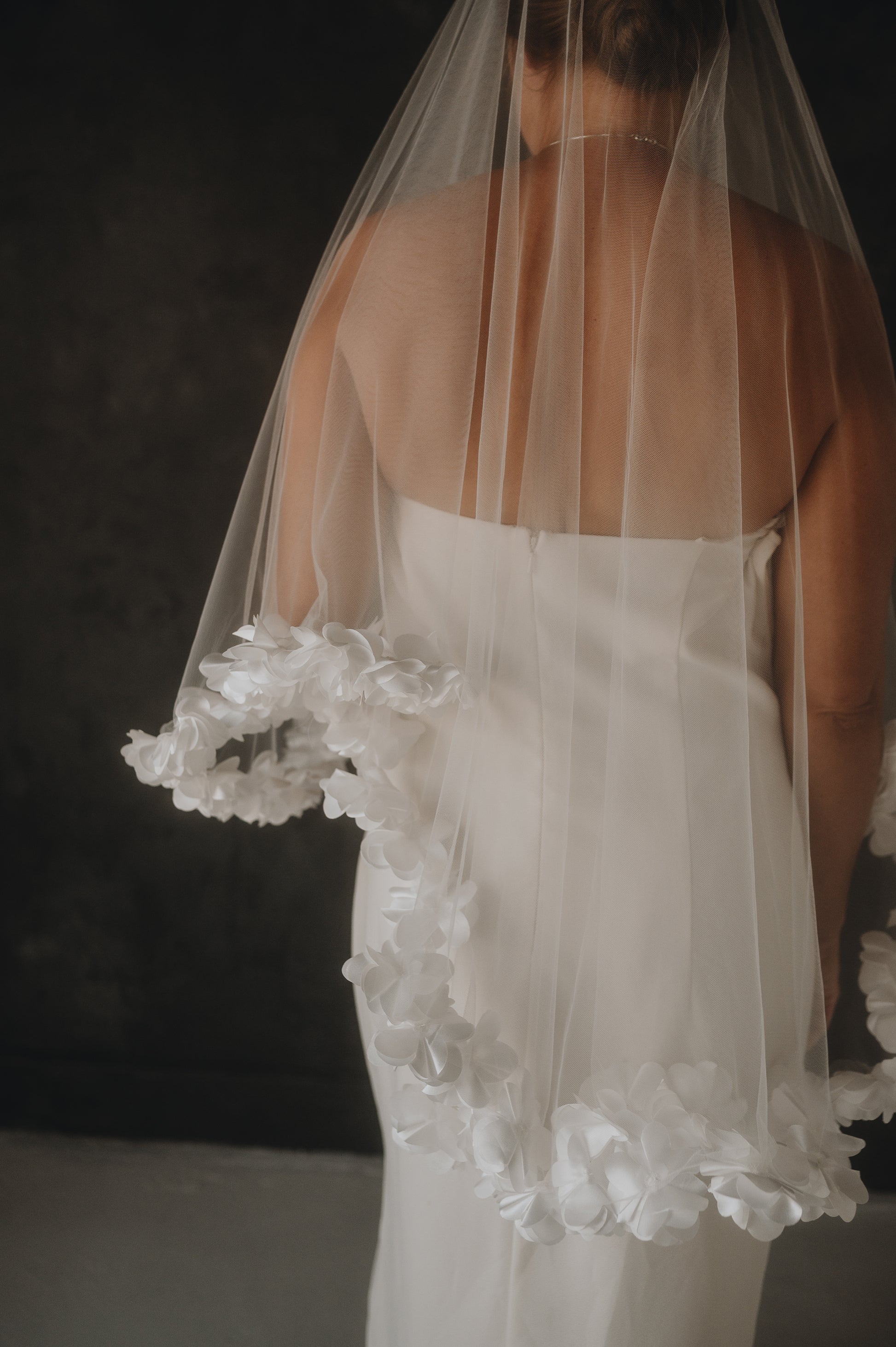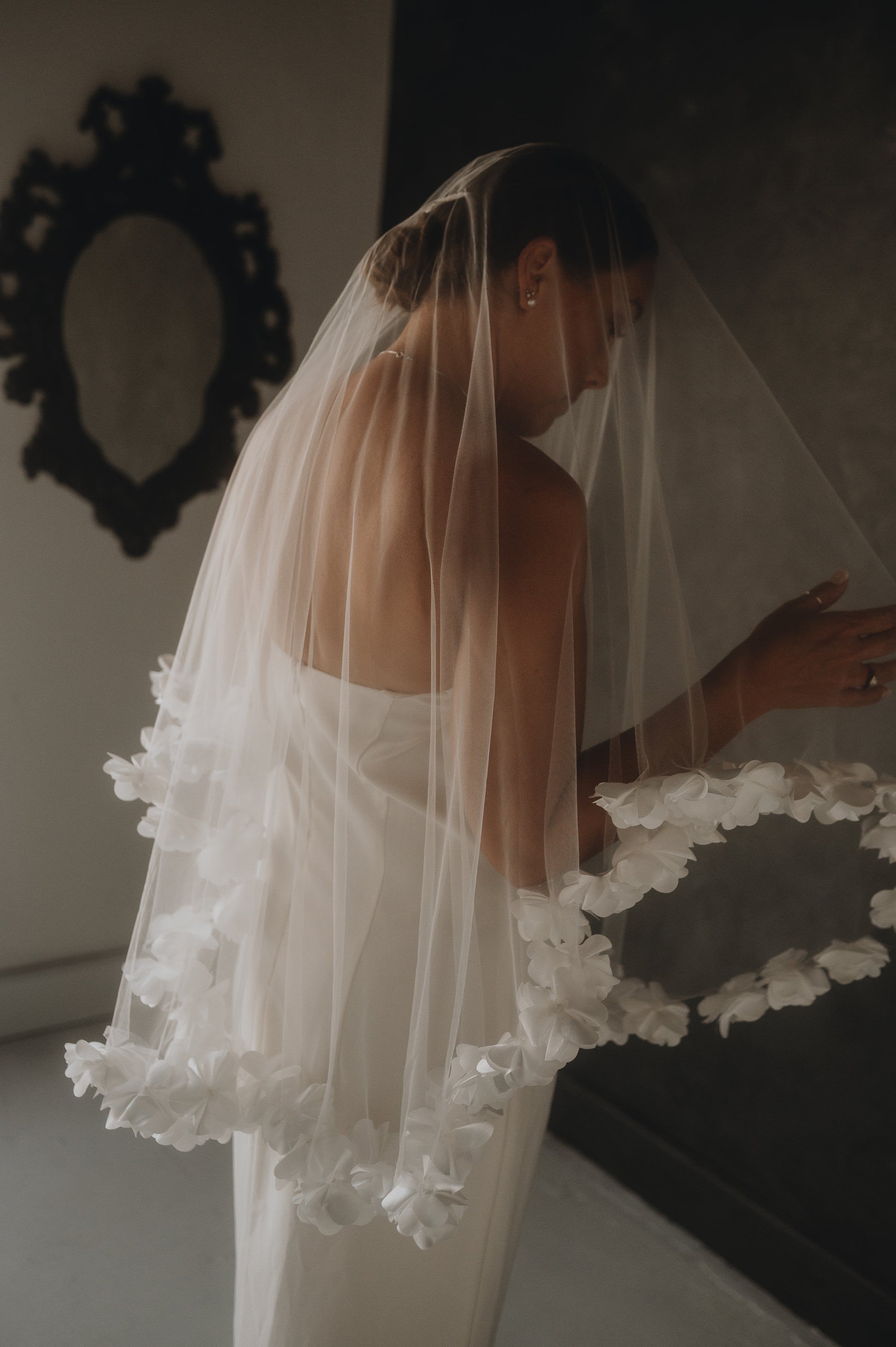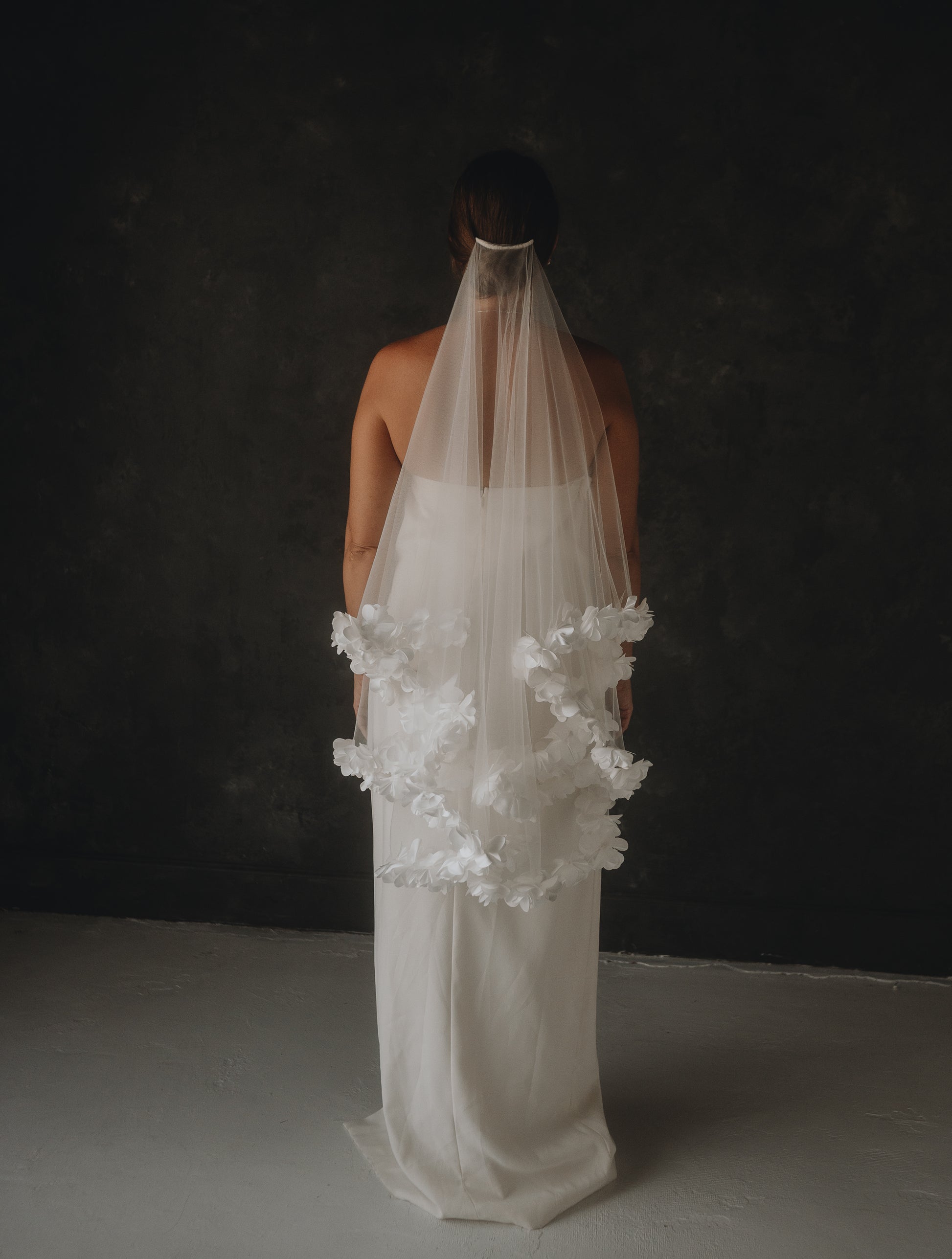 Penelope is a veil for the bride who wants to keep to traditional veils but still wants to add some spunk. She is a drop veil with 3D flowers around the entire edge. Glamorous, fun and elegant.